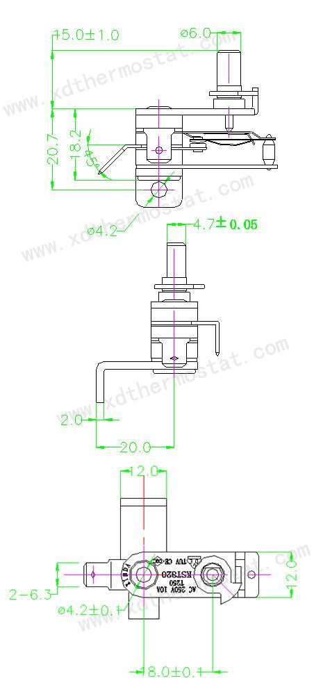 型号:KST820-17071、规格:250VAC/10A2、工作角度:270±5°3、工作温度:180±8℃4、开机角度:70±10℃(室温25℃)5、耐压:2000V/1S 击穿电流:0.5mA